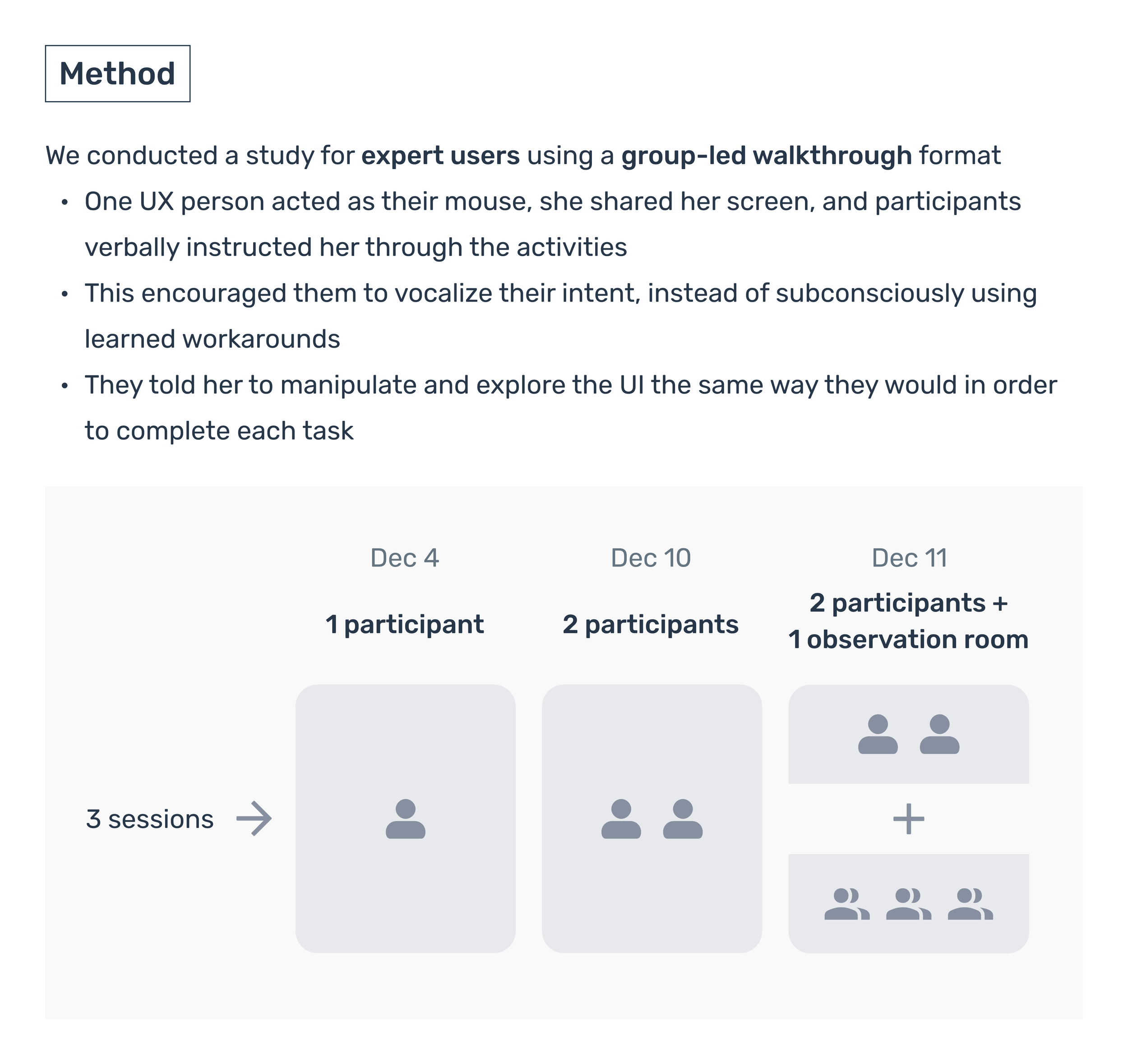 After implementation, we validated the feature with 5 subject matter experts. Using the original product requirements, we walked through 3 flows and asked them to complete 6 tasks. Feedback was largely positive. Each participant shared what they liked, their pain points, and how the experience aligned with their expectations.