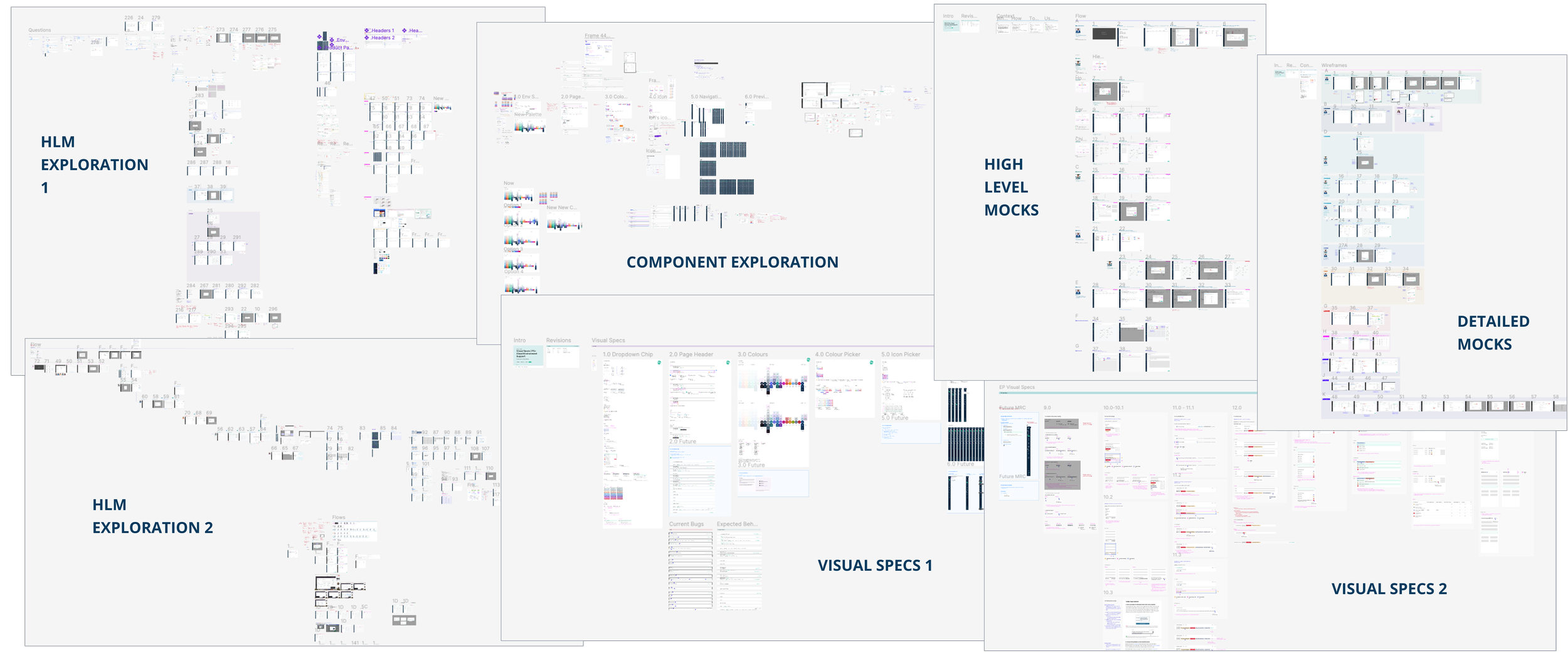 Pages of exploration, high-level mocks, detailed designs, and visual specs